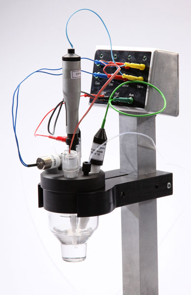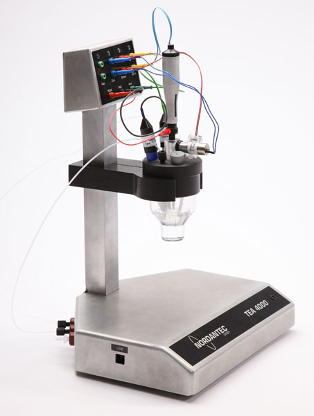 The basic equipment of the TEA 4000 includes the electronic stand, the electrodes, the software and all accessories required for laboratory analysis. Power is provided by a 12 V DC power supply, connection to the computer is via USB.Optional accessories